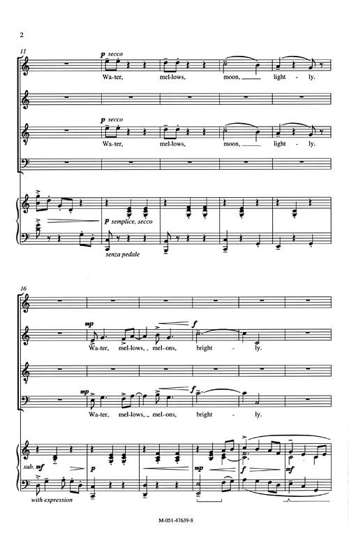 Richard Hundley, der von Sängern wegen seiner eleganten Lieder geschäzt wird, hat eines seiner beliebtesten Lieder für gemischten Chor gesetzt. Das Gedicht von José García Villa spielt mit Variationen über die Wörter 'Moonlight' und 'Watermelon' und Hundleys Vertonung versprüht den gleichen Witz und Ideenreichtum.