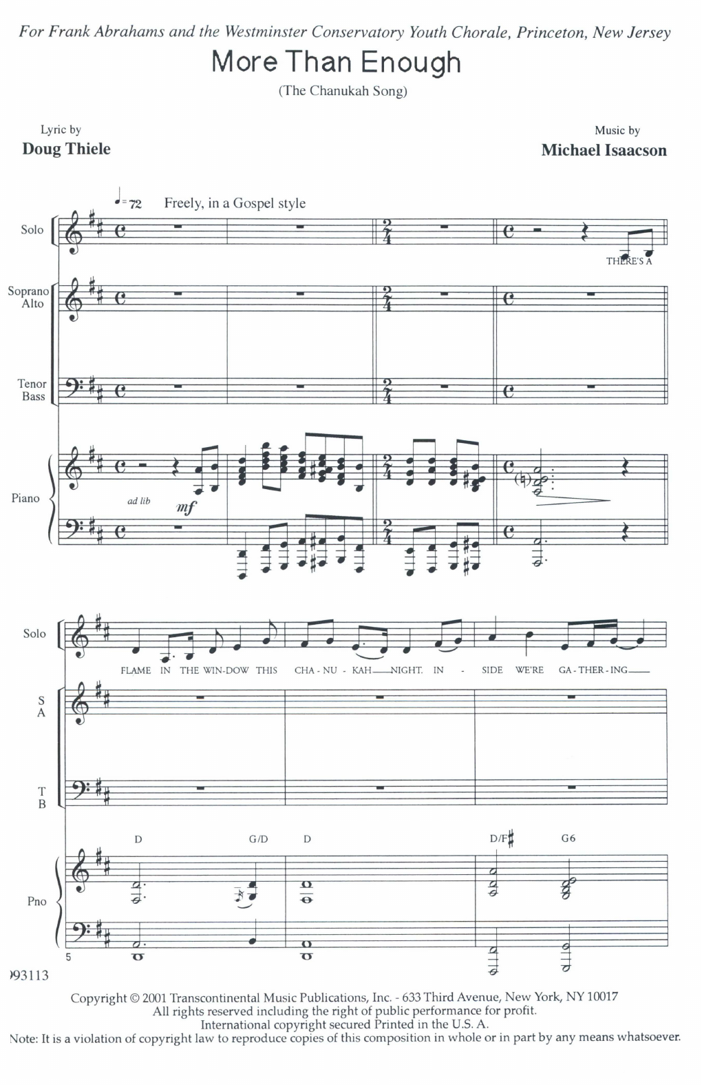 Chanukah song. A rousing gospel-style piece which teases the traditional Maoz Tsur melody. The Westminster Conservatory Youth Chorale Jewish Music Series. For SATB, solo and keyboard.