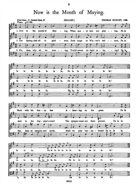 Now Is The Month Of Maying is one of the most famous of the English balletts a light part song, similar to a madrigal, frequently with a fa-la-la chorus, common among Elizabethan and ItalianRenaissancecomposers. The fun piece was written by the most famous composer of secular music in Elizabethan England, one of the foremost members of the English Madrigal School, Thomas Morley, and published in 1595. Thesong delightsin bawdy double-entendre it is apparently about spring dancing, but this is a metaphor for sex. Its imagery and puns are characteristic of the Renaissance. Now Is The Month Of Maying is arrangedhere for SATBChoir.
