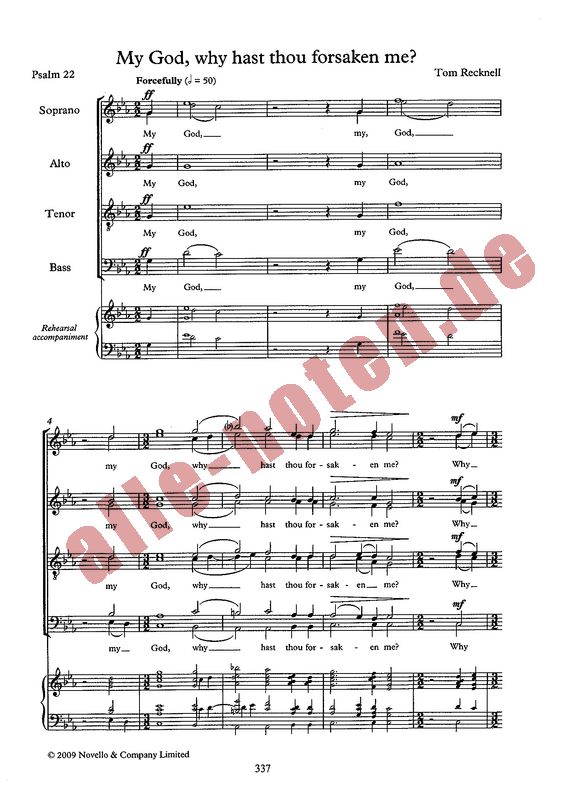 For mixed SATB chorus, unaccompanied. Includes a Piano part on the score for rehearsal purposes only. 'My God, why hast thou forsaken me?' was originally written in the summer of 2006 on a course run by the National Youth Orchestra of Great Britain. It was first performed by the choir of Eton College directed by Ralph Allwood. This motet intends to capture the anguish of Jesus final moments on the cross. The opening bars attempt to convey the horrific pain, sorrow and tragedy that these words and the climactic moment of Christ's crucifixion mean to Christians worldwide. It is also a human sentiment echoed every day by the needy, regardless of their religious views. The piece ends with a repetition of the opening phrase, followed by a blossoming 'Amen'. This expressive conclusion hints at a glimmer of hope, although the final chord is left unresolved; resolution, though suggested, is not obtained.