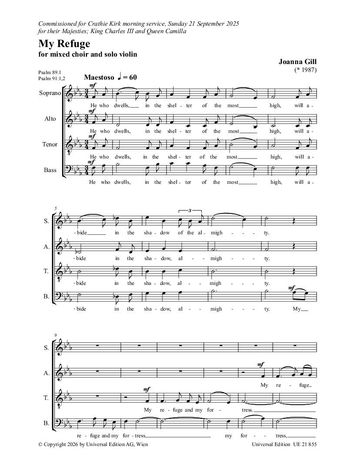Joanna Gills My Refuge für gemischten Chor und Solo-Violine ist ein inspirierendes Werk über die Kraft der Musik als Rückzugsort und seelische Stütze. Entstanden für King Charles III., entfaltet es seine Wirkung live im Konzertsaal, wo Chorleiter:innen und Sänger:innen die emotionale Tiefe und expressive Kraft direkt erleben können. Ein Stück, das klassische Musik als universelles, zugängliches Erlebnis für alle vermittelt. Joanna Gill’s My Refuge for mixed choir and solo violin is an inspiring work celebrating music as a refuge and source of solace. Composed for King Charles III, it comes alive in performance, allowing conductors and singers to experience its emotional depth and expressive power firsthand. A piece that demonstrates classical music as a universal, accessible experience for every choir. Joanna Gills My Refuge für gemischten Chor und Solo-Violine ist ein inspirierendes Werk über die Kraft der Musik als Rückzugsort und seelische Stütze. Entstanden für King Charles III., entfaltet es seine Wirkung live im Konzertsaal, wo Chorleiter:innen und Sänger:innen die emotionale Tiefe und expressive Kraft direkt erleben können. Ein Stück, das klassische Musik als universelles, zugängliches Erlebnis für alle vermittelt.