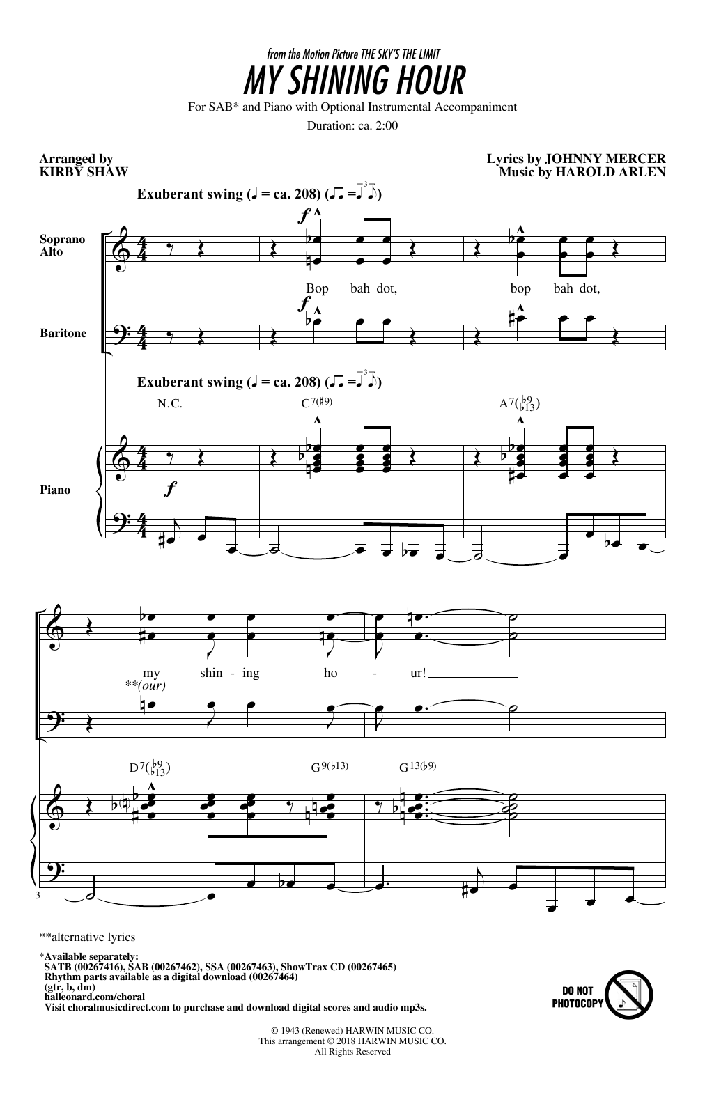 Following the huge success by Harold Arlen of Over The Rainbow he was both incredibly busy and incredibly successful. In 1943 he wrote the film score for The Sky's The Limit and, although the film was not a huge success, My Shining Hour was the #1 song of its day. Since then if has been covered by countless jazz musicians as well as song stylists. Here is a strong arrangement for your choir that they will love to sing.