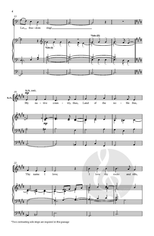 This noble and patriotic piece is a setting of the well-known tune 'America' (also known as the British National Anthem). Wilberg opens effectively with solo unison men, and the accompaniment creeps in quietly. A women's verse follows, before full choral homophony creates an atmosphere of worship and optimism.