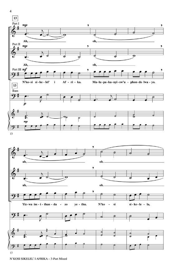 This dignified song by Enoch Mankayi Sontonga (1860-1904) and Sek Mqhayi (1875-1945) is the Pan-African Anthem and is sung throughout the continent. This setting may be sung a cappella, or with chimes and layered percussion. Available for SATB (opt. a cappella), SSA (opt. a cappella) and 3-Part Mixed. Parts for Chimes and Bass Instrument included. Performance Time: Approx. 3:00