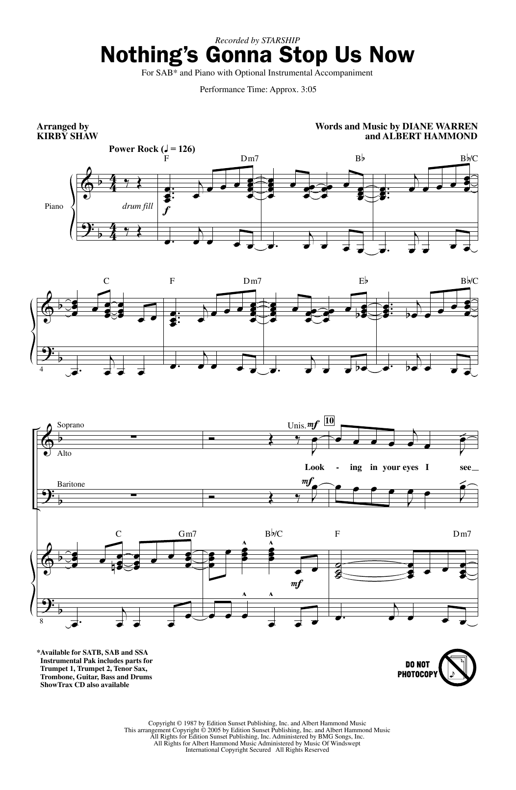 This Jefferson Starship power ballad has been arranged as a driving rock and roll anthem perfect for choreography. Great lyrics and a powerful melody combine with relentless rhythms and horns. Hot! Available for SATB, SAB and SSA. Instrumental Pak includes parts for Trumpet 1, Trumpet 2, Tenor Sax, Trombone, Guitar, Bass and Drums. ShowTrax CD also available. Performance Time: Approx. 3:05