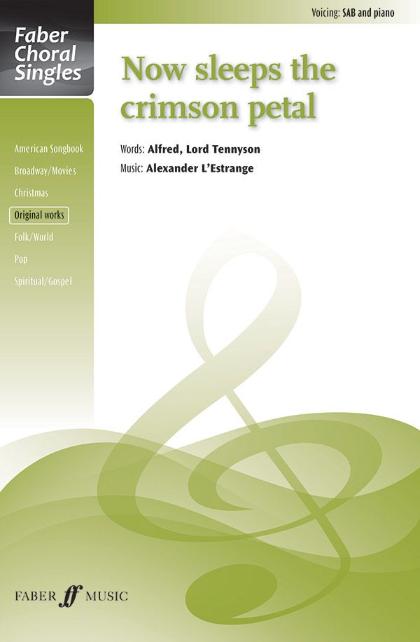 Now sleeps the crimson petal (Alfred, Lord Tennyson, 1809--92) entreats a lover to emulate nature's patterns, imploring that they first waken like the firefly and then 'slip into my bosom and be lost in me.' The music is inspired by composers Gerald Finzi and Roger Quilter, two of the most prominent figures in English song in the first half of the twentieth century. Faber Choral Singles offer a series of beautifully crafted arrangements in a diversity of musical styles for today's choirs. From Broadway, pop and folk to spirituals, gospel and original works, the Faber Choral Singles series guarantees the perfect repertoire for every occasion.