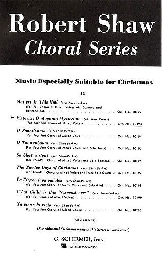 Tomas Luis de Victoria's O Magnum Mysterium is a beautiful piece for four-part (SATB) choir a cappella and has been edited by Alice Parker and Robert Shaw. A piano accompaniment part has been scored for rehearsal purposes.