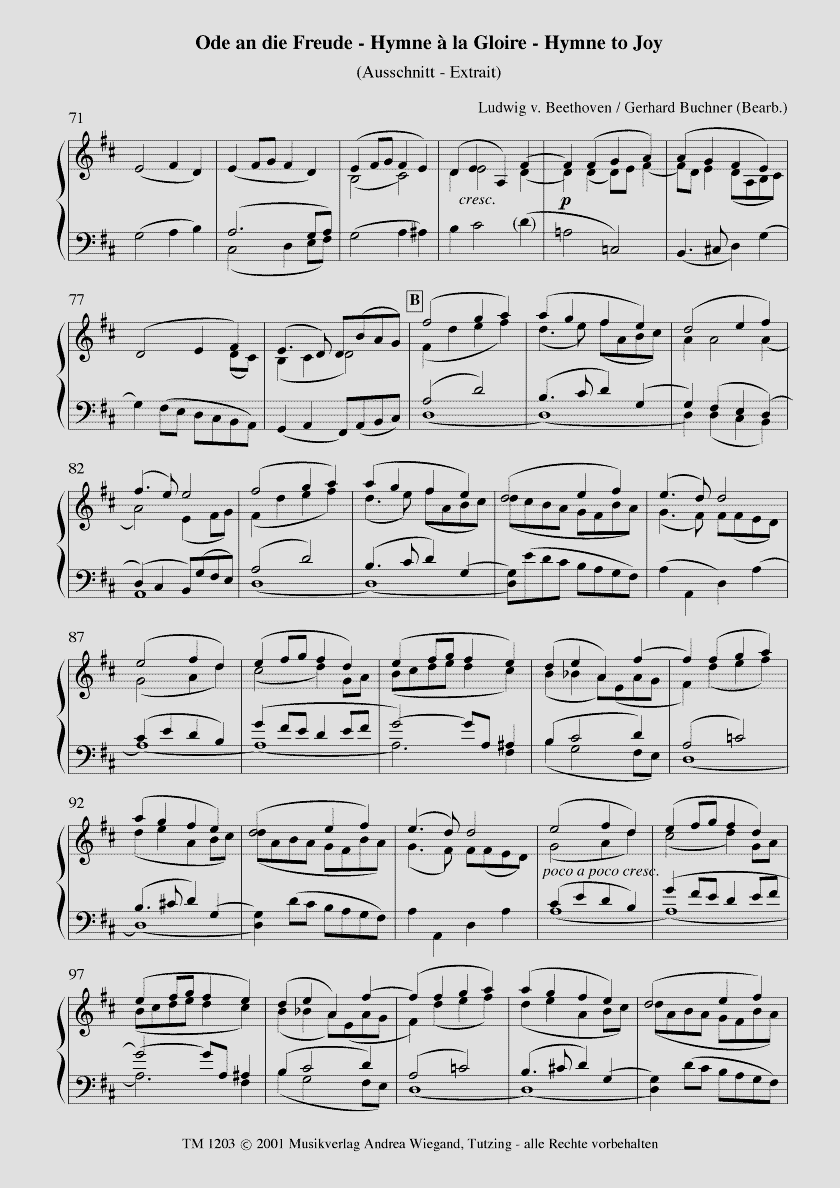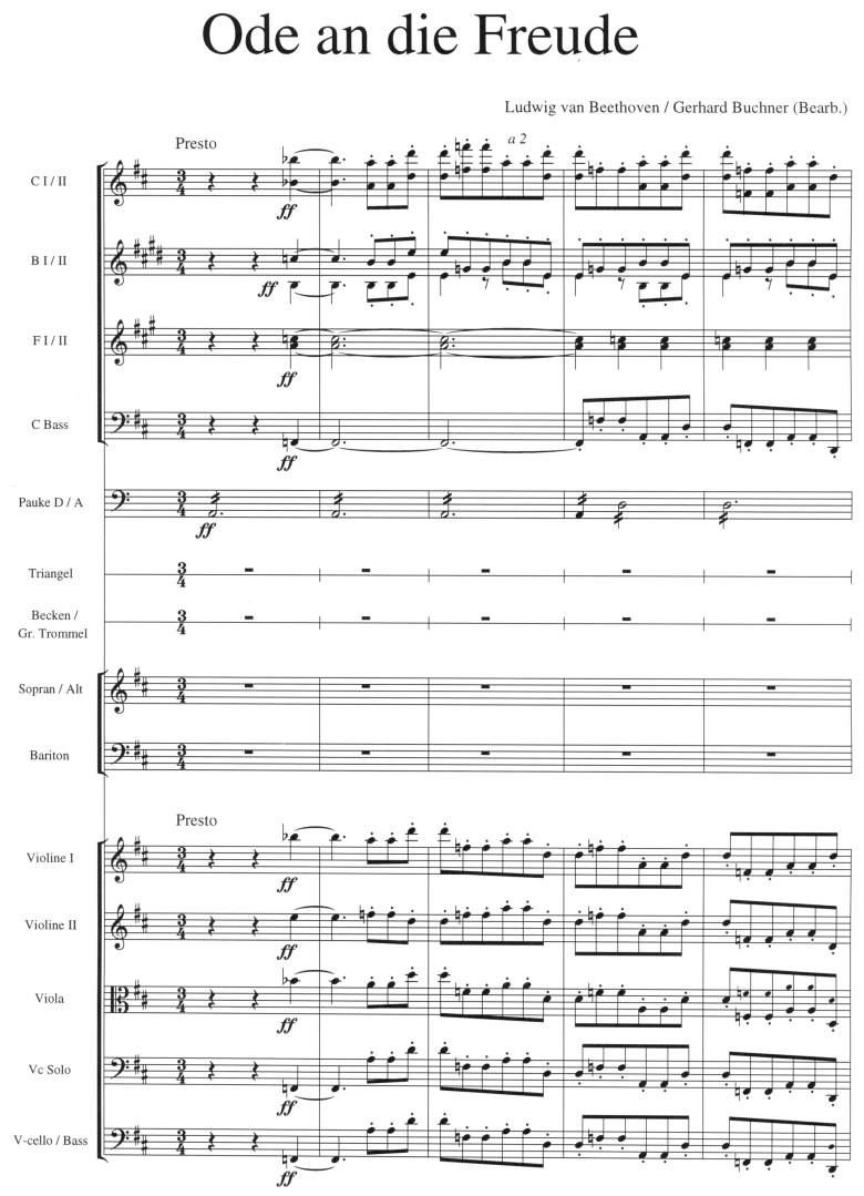 Auszug aus dem vierten Satz der Neunten Sinfonie Klavierauszug und 10 Chorstimmen Die Ode ist mehr als die Europa-Hymne: Die ganze Schönheit und Genialität dieser klassischen Melodie erschliesst sich erst im Zusammenhang mit ihrer variationsreichen Verarbeitung im Finalsatz der 9. Sinfonie. Diese neue Bearbeitung fasst - unter Verzicht auf Gesangssoli - wesentliche Chor - und Orchesterstellen zusammen. So wird ein Auszug aus diesem Gipfelwerk der klassischen Musik auch für Schul- und Laienensembles wirkungsvoll sing- und spielbar.