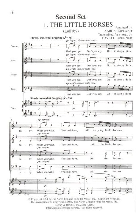 In dieser Ausgabe sind erstmals alle Arrangements für gemischten Chor von Coplands populären Songs von den Bearbeitern David Brunner, Irving Fine, Glenn Koponen, Gregory Rose, and R. Wilding-White zusammengestellt. Sie beinhaltet ausserdem die originalen Hinweise zu jedem der Songbücher.