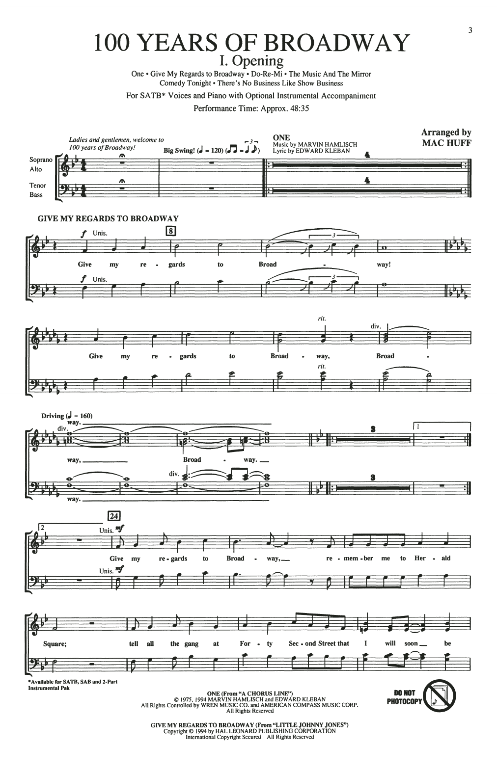 Celebrate the history of Broadway and our great heritage of musical theater in this marvelous choral medley by Mac Huff. From the music of Tin Pan Alley to state-of-the-art contemporary Broadway, you'll treasure the magic of an entire century of entertainment, laughter, and beautiful music! Available: SATB Director's Score, SAB Director's Score, 2-Part Director's Score, SATB Singer's Edition, SAB Singer's Edition, 2-Part Singer's Edition, Instrumental Pak, Preview CD, ShowTrax CD. Performance Time: Approx. 48:35.