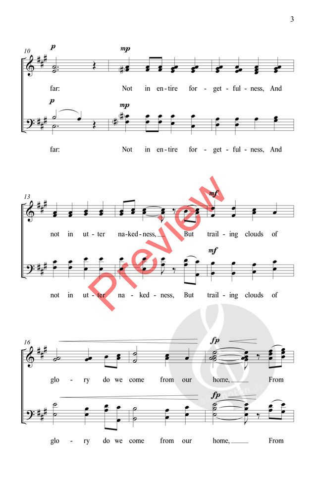Eine atemberaubende A-cappella-Vertonung verwendet einfache Rhythmen und enge Harmonien, um die kraftvollen Bilder von Wordsworths zeitlosem Text zu vermitteln: "Unsere Geburt ist nur ein Schlaf und ein Vergessen, die Seele, die sich mit uns erhebt, der Stern unseres Lebens, hat anderswo ihren Platz und kommt aus der Ferne". Ein Auszug aus Intimations of Immortality Dauer ca. 3:30