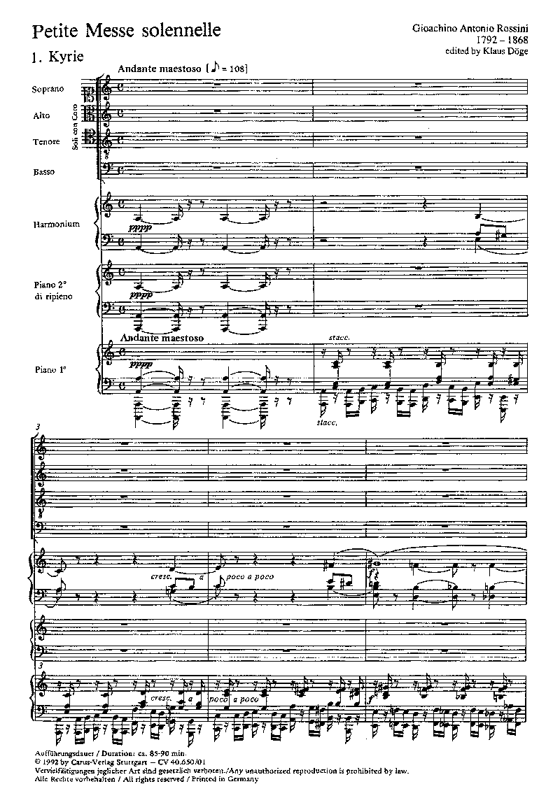 Die Petite Messe solennelle von 1863 ist neben dem Stabat Mater Rossinis zweite umfangreiche sakrale Komposition. Die Messe ist ein Gelegenheitswerk, geschrieben für die Einweihung der Privatkapelle eines wohlhabenden Pariser Adligen. Dies erklärt die reduzierte instrumentale Begleitung von zwei Klavieren und Harmonium. Freilich erzeugt gerade diese dezent an gehobene Salonmusik erinnernde instrumentale Einkleidung ein unverwechselbares Timbre, das durch die typisch Rossinianische Rhythmik noch ein zusätzliches Flair erhält.