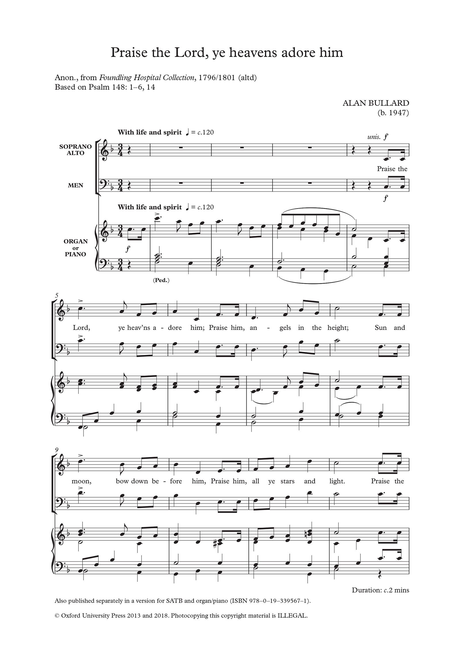 From the collection Anthems for SA and Men, 'Praise ye the Lord, ye heavens adore him' is a spirited anthem scored for SA & men with piano/organ. The text is based on Psalm 148 and is suitable for performance throughout the year.