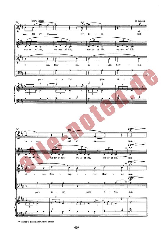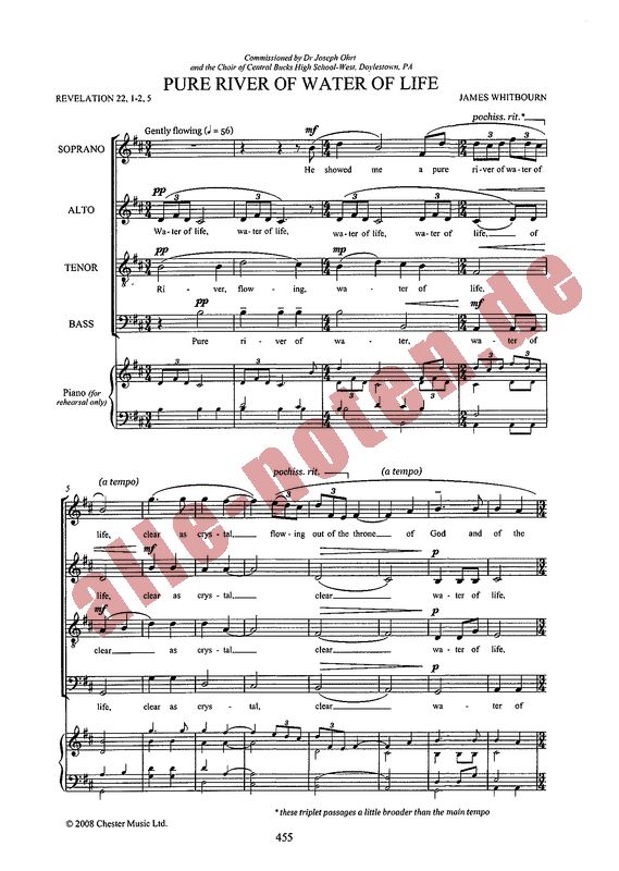 Written for unaccompanied SATB choir. Pure river of water of life by James Whitbourn was first performed on May 17th 2008 by the Central Bucks High School-West, Doylestown, Chamber Choir, Choirmaster, Dr Joseph Ohrt. This performance was conducted by Charles Bruffy at Trinity Episcopal Cathedral, Trenton, New Jersey, USA.