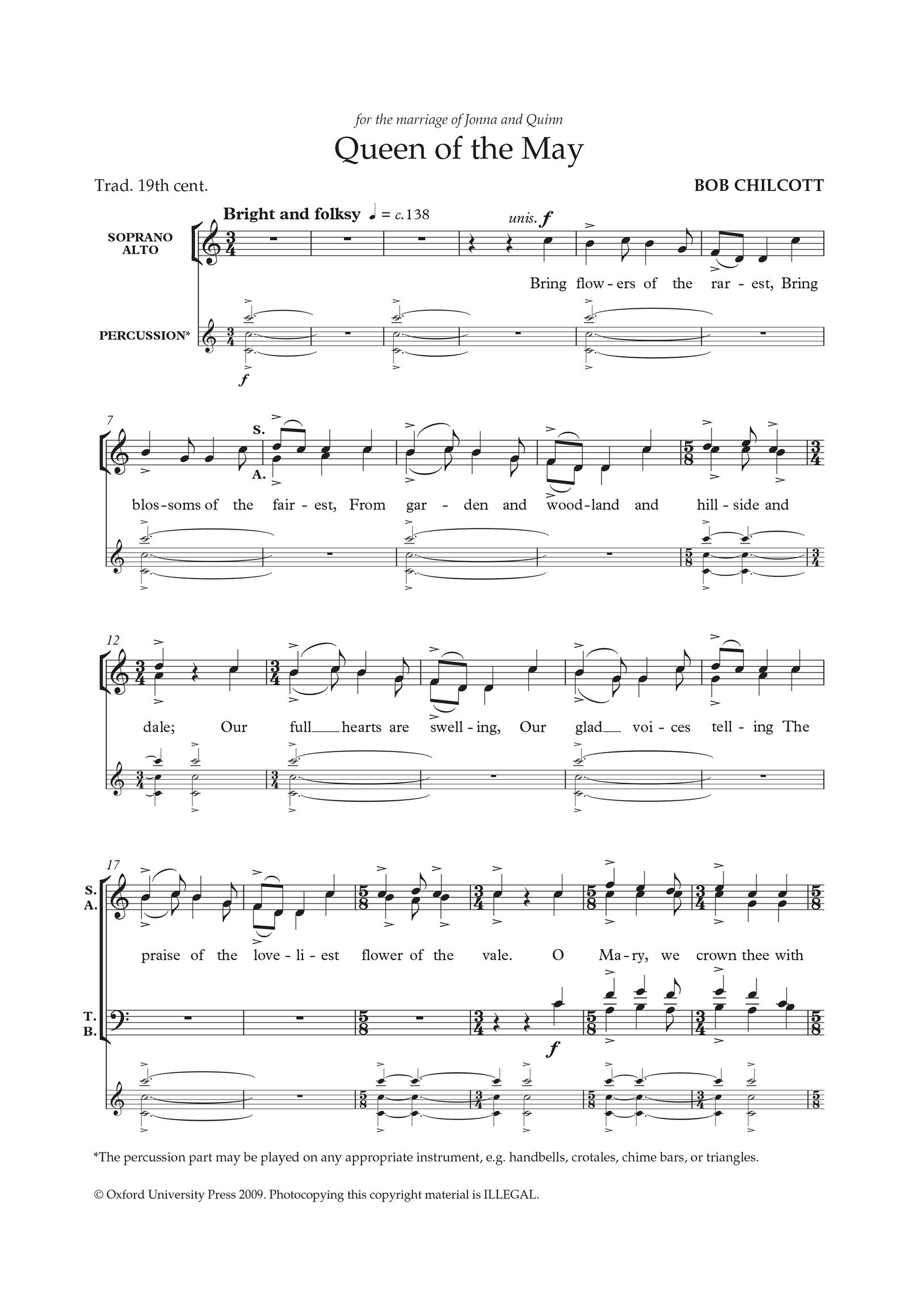 From the collection Bob Chilcott Anthems 2, 'Queen of the May' is Chilcott's lively setting of a 19th century text, scored for SATB. The time signature of the folk-influenced melody moves between 3/4 and 5/8, and the folk atmosphere can be further enhanced by the addition of a percussion accompaniment.