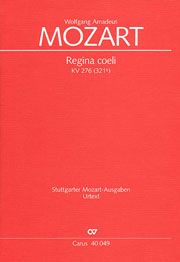 Marienantiphon - Im Gegensatz zu den beiden 'Regina coeli'-Vertonungen KV 74 und 127, die mit Solosopran und Chor besetzt sind, verwendet Mozart in KV 276 das Solistenquartett, das ähnlich wie in den Salzburger Messen oft nur in kurzen Einwürfen mit dem Chor dialogisiert. Zudem besteht die vorliegende Vertonung nur aus einem Satz, während die anderen beiden mehrere kontrastierende Sätze aufweisen. Soli SATB, Coro SATB, 2 Ob, 2 Ctr, Timp, 2 Vl, Vc/Cb, Org