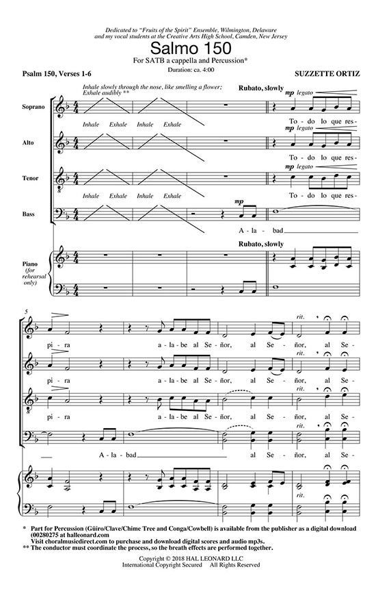 Beginning with breath as the only sound, then moving into a slow and legato rubato intro. This is one of the most creative treatments of Psalm 150. Sung in Spanish with excellent IPA and translation guides. A cappella with hand percussion create a Latin flavor that will have everyone dancing.
