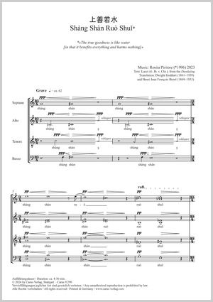 Die Komponistin und Pianistin Rosita Piritore arbeitet in ihrem anspruchsvollen, atmosphärischen Werk Shàng Shàn Ruò Shui mit Klangflächen, die immer wieder von einzelnen geflüsterten Silben durchbrochen werden. Für ambitionierte Laienchöre, die den Zugang zu Neuer Musik suchen, ist dieses Werk sehr gut geeignet. Die überschaubare Länge und die klare Gliederung in sehr kurze Abschnitte erleichtern die Probenarbeit. Den Text für ihr Werk hat Rosita Piritore im Daodejing gefunden, einer Sammlung von Spruchkapiteln, die der chinesischen Legende nach von einem Weisen mit dem Namen Laozi stammen soll und die Etablierung eines harmonischen Zusammenlebens und letztlich des Weltfriedens zum Ziel hat.