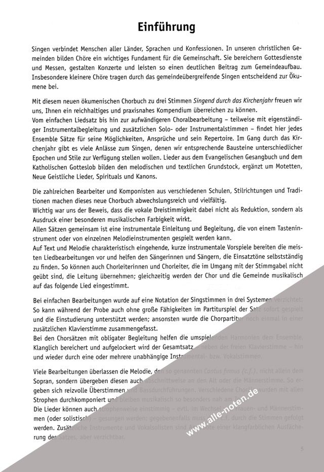 Das dreistimmige geistliche Chorbuch wendet sich an all die Chöre, die mit 'Männerschwund' zu tun haben und doch weiterhin den Wunsch verspüren, als gemischtes Vokalensemble in der Kirche singen und auftreten zu können. Das Kompendium orientiert sich am Kirchenjahr und bietet Chorleitern und Chören stilistisch vielfältiges Material für die Probenarbeit und für eine lebendige musikalische Gottesdienstgestaltung. Es enthält die beliebtesten Kirchenlieder aus Gesangbuch und Gotteslob, kleine wirkungsvolle Motetten, schwungvolle Neue Geistliche Lieder, groovende Spirituals und interessante zeitgenössische Werke. Der Schwierigkeitsgrad reicht von einfach bis mittel. Viele der über 100 dreistimmigen Sätze sind eigens für dieses Chorbuch komponiert worden. Damit auch die vierstimmigen 'Alten Meister' nicht auf der Strecke bleiben, wurden etliche Sätze dreistimmig eingerichtet. Auch dreistimmige Originalkompositionen sind enthalten. Der bewährte deutliche Bosse-Notenstich und wertvolle Aufführungstipps am Ende des Buches sind weitere Kennzeichen dieser Sammlung.