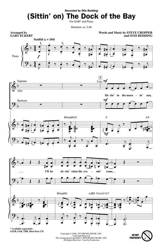 This #1 pop hit from 1968 by Otis Redding has retained its immense popularity over the decades with its soulful harmonies and reflective lyrics that speak to listeners of all ages. This arrangement is highlighted by a fresh rhythmic and harmonic approach that is immediately compelling. Available separately: SATB, SAB, TBB, ShowTrax CD. Duration: ca. 2:46.
