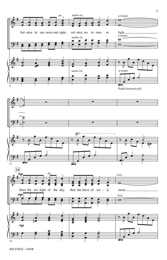 A sense of awe and mystery is depicted in the text and music of this original work as well as our unique connection to nature, the earth, the sun and the movement of the spheres. Although not specifically limited to the Winter Solstice, the mood of this piece gives it special appeal for winter and holiday programming. Available separately: SATB, SSA. Duration: ca. 2:55.