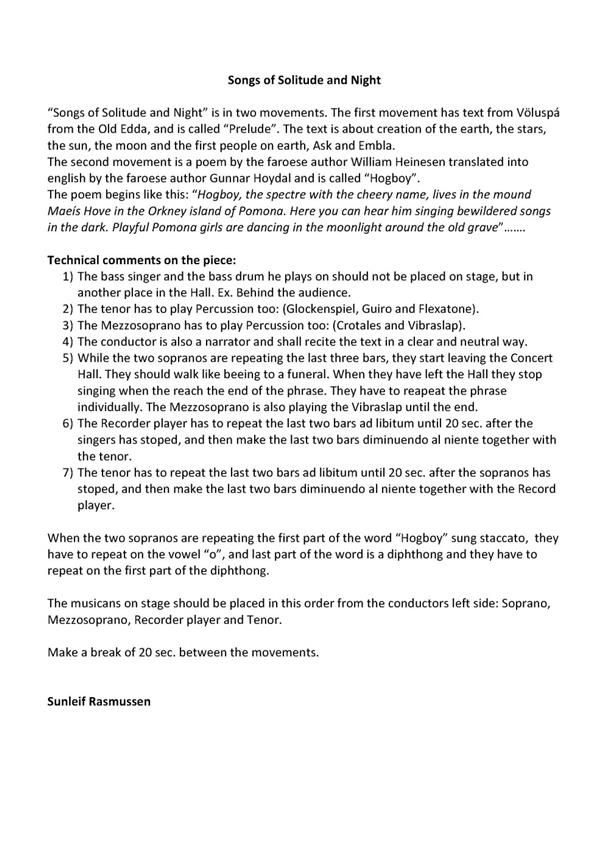 Songs of Solitude and Night' is in two movements. The first movement has text from Völuspá from the Old Edda, and is called 'Prelude'. The text is about creation of the earth, the stars, the sun, the moon and thefirst people on earth, Ask and Embla. The second movement is a poem by the faroese author William Heinesen translated into english by the faroese author Gunnar Hoydal and is called 'Hogboy'. The poem begins like this: 'Hogboy, thespectre with the cheery name, lives in the mound Maeís Hove in the Orkney island of Pomona. Here you can hear him singing bewildered songs in the dark. Playful Pomona girls are dancing in the moonlight around the old grave'