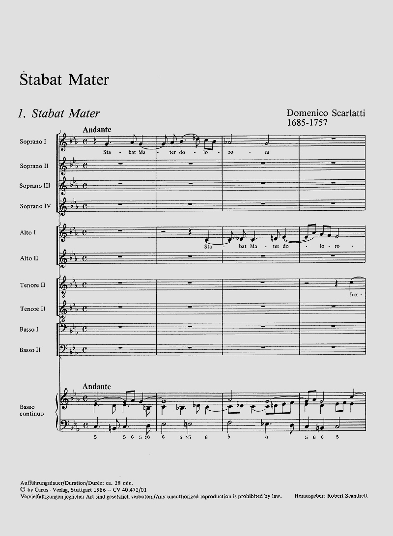 Scarlattis Vertonung des 'Stabat Mater' kann als sein Meisterwerk innerhalb der Chorliteratur bezeichnet werden. Sein großer Umfang, seine einzigartige Anlage, sein dramatischer Schwung, sein lyrischer Anmut stellen es in den Kreis der großen Musikschöpfungen in der ersten Hälfte des 18. Jahrhunderts. - Coro SSSSAATTBB, Bc