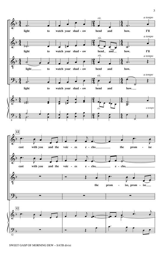 Clarity of text is paramount in this elegant a cappella work that compares the emotions of young lovers to the imagery of spring renewal. Rich harmonies and contrasts of texture and dynamics give this work an intensity that will be immensely fulfilling. Duration: ca. 4:00.