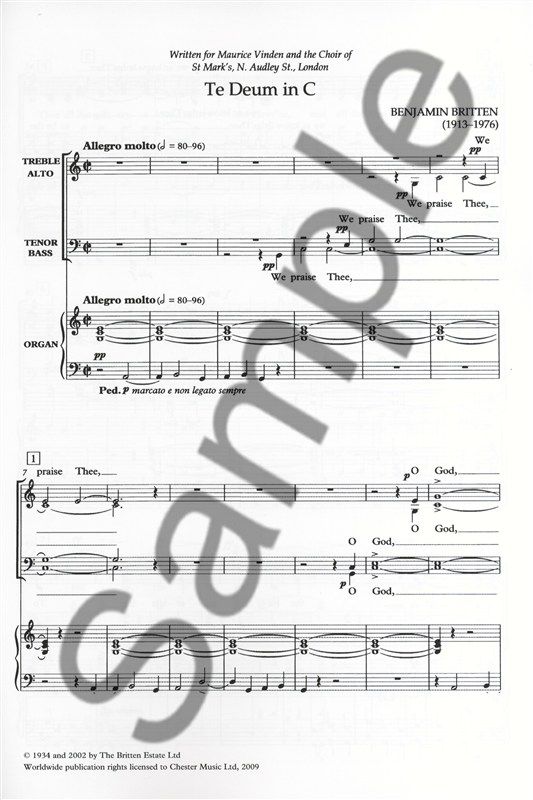 Britten's Te Deum In C is arranged for Soprano solo, SATB choir and Organ accompaniment. In preparing for publication the 1935 orchestral version of Britten's Te Deum in C, it became clear that there were a number of discrepancies between the manuscript and the original 193 vocal score. Some of these were minor: different articulation and dynamic markings, something Britten was later very fussy about, but perhaps left unchanged on proof because of his relative inexperience at this stage of his career with the processes of music publishing. Others were more important: wrong pedal notes, for example, which Britten failed to notice on proof, and which have been perpetuated in performances and recordings for nearly seventy years. These have been corrected in the new edition of the vocal score and in the orchestral score (Britten clearly used the published vocal score to prepare his orchestral version). The two versions have been made consistent in other details - rehearsal cues and bar numbers, for example - since Britten intended choristers to use the vocal score to perform the orchestral version. This would have been an easy task, for these is little discrepancy in essential details between versions (a rare departure occurs in bars 53 to 56, where the works 'Lord God of Sabaoth' are unaccompanied in the orchestral version, but doubled by Organ in the original). Sustained Organ chords are often filled out with arpeggiated string writing, while the spacing of chords is frequently much wider in the string version, with melodies transposed into different octaves. Although harmony in both versions is identical, voice leading is sometimes altered in the latter to make it better suited to the idioms of the instruments concerned.