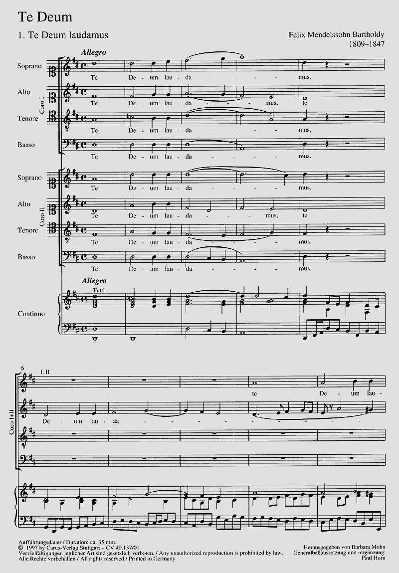 Eines der schönsten geistlichen Frühwerke Mendelssohns, das von den Te-Deum-Vertonungen Händels inspiriert und mehrfach in der Berliner Singakademie aufgeführt wurde. Soli oder kleiner Coro SATB/SATB, Coro SATB/SATB, Vc/Cb, Org