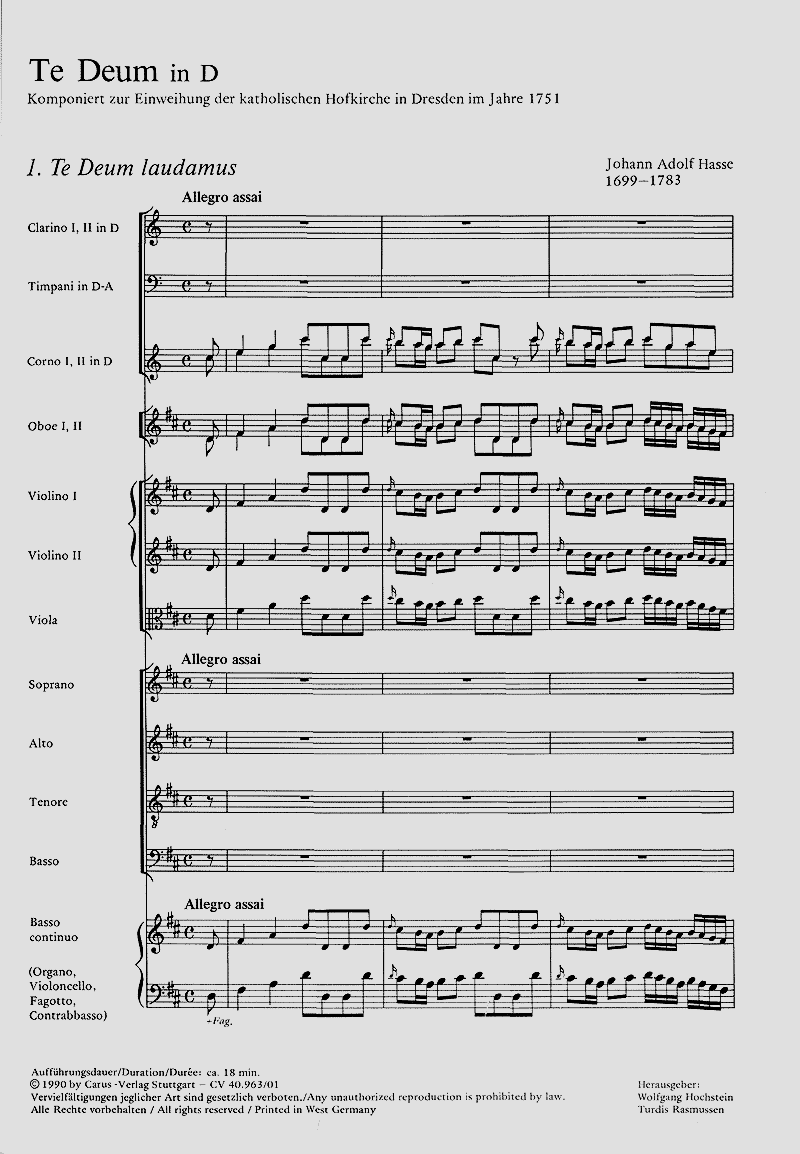 Die festliche Komposition mit ihrer für die damalige Zeit großen Orchesterbesetzung wurde am 29. Juni 1751 anlässlich der Einweihung der neuen katholischen Hofkirche in Dresden erstmals aufgeführt. Soli S (SSAATB), Coro SATB, 2 Fl, 2 Ob, 2 Cor, 2 Tr, Timp, 2 Vl, Va, Bc