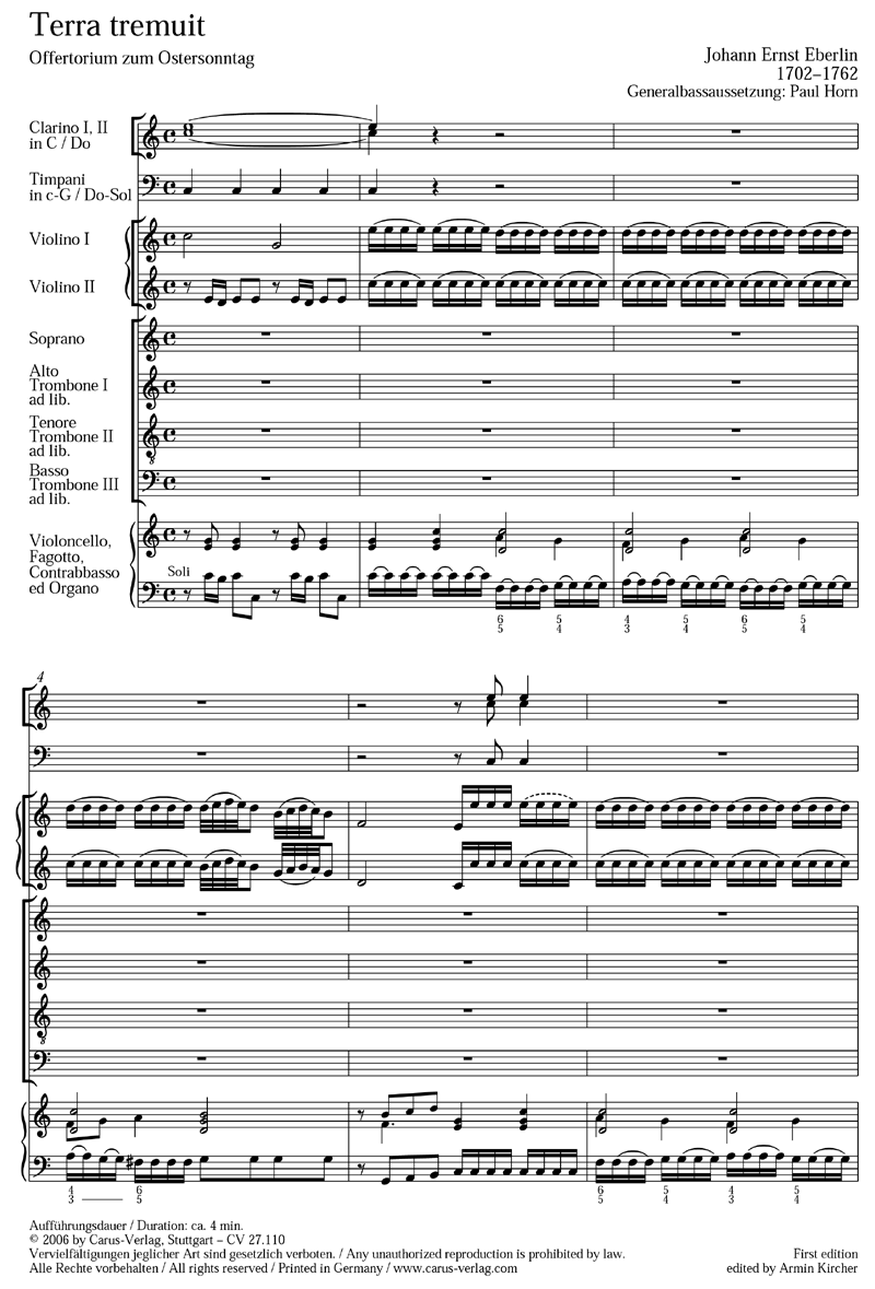 Entstanden ist Eberlins programmatische Vertonung des Offertoriums "Terra tremuit" für die festliche Liturgie des Ostersonntags am Salzburger Dom, der im 17. und 18. Jahrhundert ein Zentrum der Pfleger von mehrstimmigen Offertoriumsvertonungen war. Die Verse 9 und 10 aus Psalm 76 (75) mit der bildhaften Schilderung des Erbebens und Verstummens der Erde sind Eberlins Textvorlage für das Offertorium. Die Schilderung des Erdbebens drückt Eberlin in den Streicherstimmen durch ein ausnotiertes Tremolo und in den Vokalstimmen mit dem Silbenstaccato beim Wort "tremuit" aus. Die Auferstehung wird durch die aufsteigende Tonfolge bei den Worten "dum resurgeret" in Musik gesetzt. Ein Alleluja beschließt das Werk.