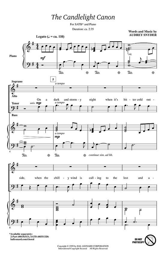 Now available for mixed voices, the magic and imagery of a candle's glow on a winter's night is expressively depicted in this lovely original canon. Ideal for winter, holiday, and Christmas programming.