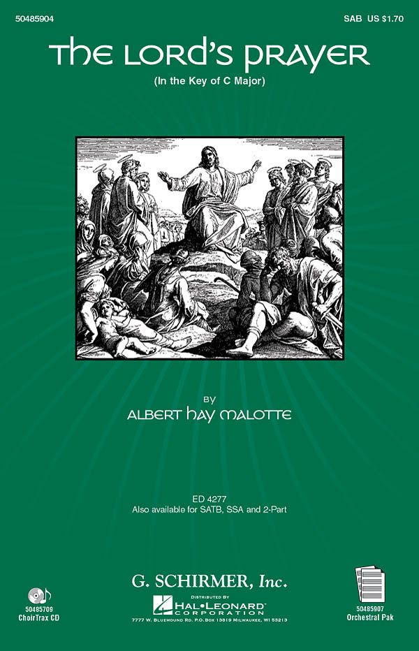 Available for the first time! The Lord's Prayer by Albert Hay Malotte is now available in the key of C, with a recorded accompaniment available on CD and orchestra score and parts. Ideal for church and sacred concert performance. Available for SATB, SAB, SSA and 2-Part. ChoirTrax CD available. Orchestral Pak also available. Performance Time: Approx. 2:30