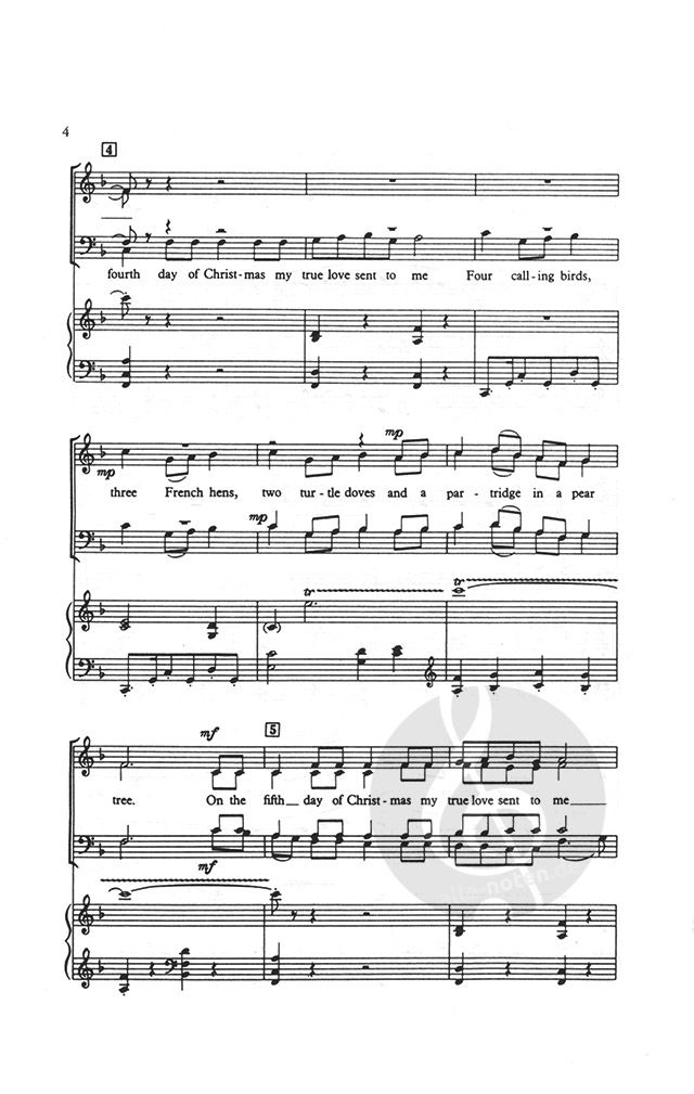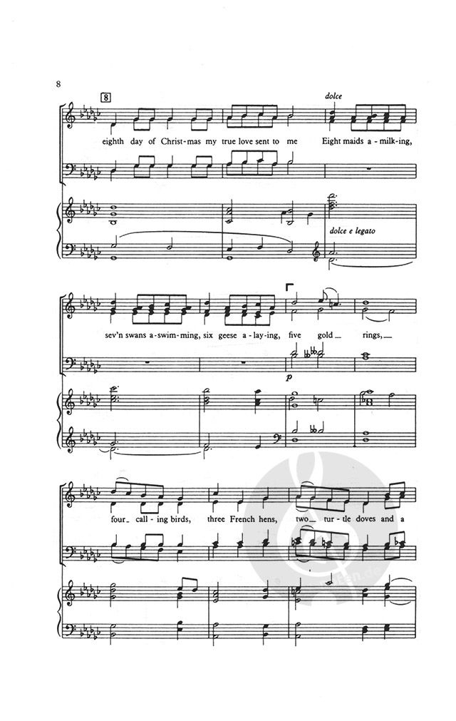 For SATB and piano or orchestra (1. 2. 0. 1-2. 0. 0. 0-Perc-Hp-Str) or brass ensemble (4tpt, 3tbn, tuba, perc, organ). Also available in Carols for Choirs 2 and 100 Carols for Choirs.