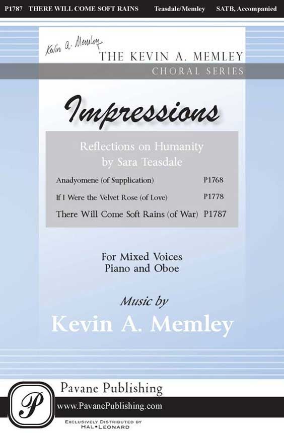 Impressions (Reflections on Humanity von Sara Teasdale) ist ein Satz von drei herausragenden Stücken von Kevin A. Memley für SATB-Divisi-Stimmen (ursprünglich für Diskantchor). Die Texte sind beliebte Favoriten, und Kevins Bearbeitungen sind exquisite Meisterwerke. Obwohl die drei Stücke einzeln veröffentlicht werden, sind sie am besten als Trilogie zu hören. Hervorragend geeignet für High School und College. Auch in SSAA erhältlich, P1448.