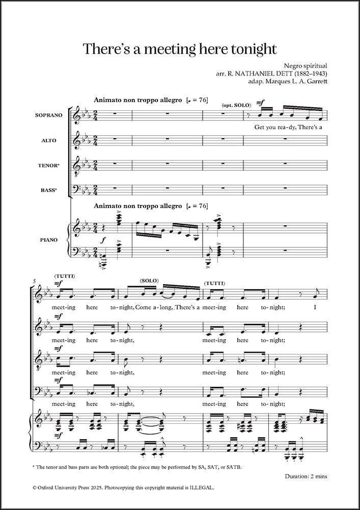 R. Nathaniel Dett's arrangement of this Negro spiritual has been adapted by Marques L. A. Garrett, and can be performed by SA, SAT, or SATB from this score. Expressive soprano-only lines, which may optionally be sung as a solo, interact in a call-and-response pattern with the full choir.