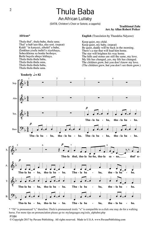 Thula Baba is an African lullaby from the Zulu tribe that is a well-known melody through the continent. This a cappella arrangement maintains the gentle qualities of a mother's song to her child while building in interest and harmony. The solo line can be sung by a single voice or a children's choir. Effective as a soft concert closer or ethnic offering for high school, community or college choirs. Medium in difficulty.
