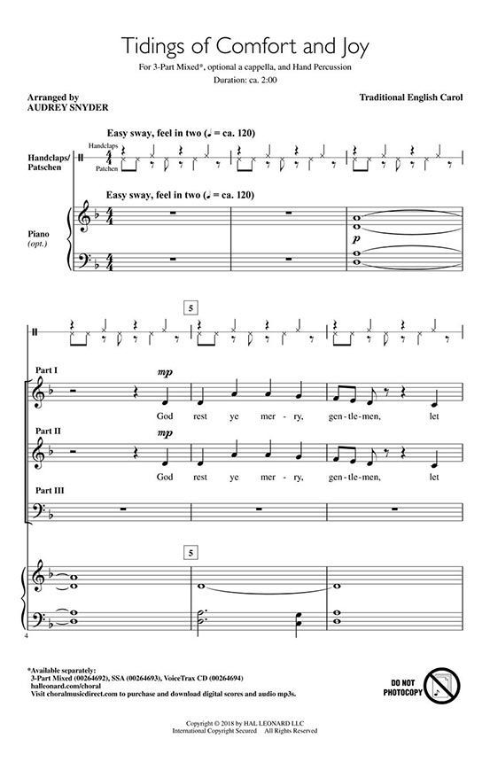 Hier ist eine neue Variante dieses traditionellen englischen Liedes. Der Gesang ist leicht und rhythmisch und wird Ihre Zuhörer überraschen. Eine Klavierstimme wird als Begleitung angeboten, aber dieses Arrangement funktioniert genauso gut, wenn es a cappella gesungen wird. Und optionale Handclaps und Percussion-Parts machen dieses Stück zu einem besonderen Bestandteil Ihres Winterkonzerts.