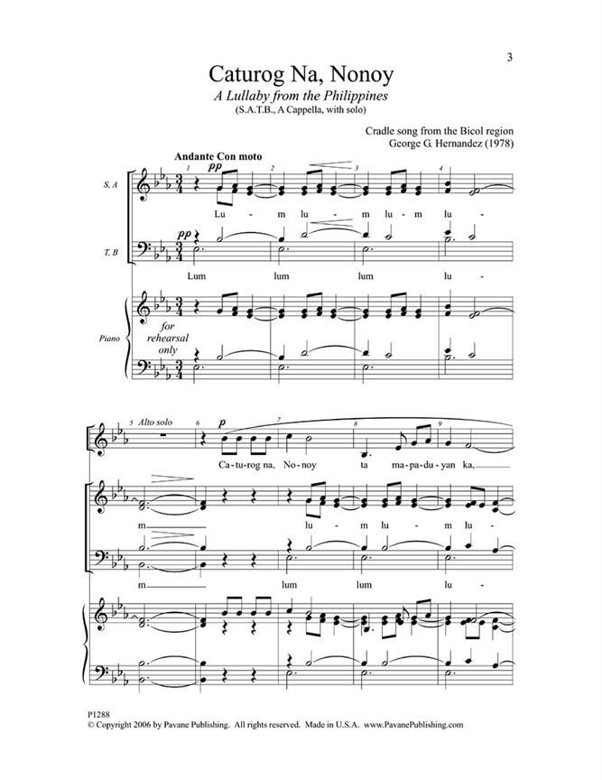 New voicing! Here's a traditional canoe song from Polynesia that sounds quite impressive with a cappella voices, handclaps, and percussion instruments. The call and response format of Greg's well-designed arrangements suggest people communicating from canoe to canoe as they travel between islands.