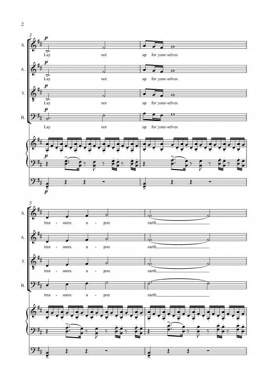 Jonathan Dove's Treasures in Heaven is a 6.5 minute work for organ and SATB choir which sets Matthew 6:19-21 from the Bible, a text that exhorts the reader to gather treasures in heaven rather than on earth since where the treasure is, there will also be our hearts. The energetic piece is driven from the organ part with the choir singing in rhythmic but homophonic blocks.