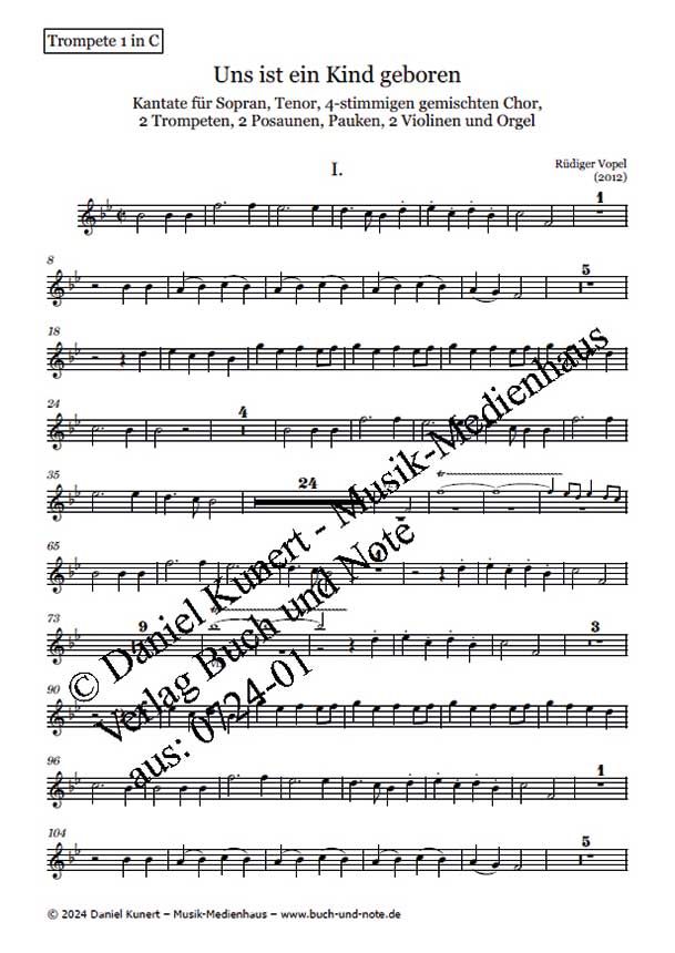 - Besetzung Soli (ST), gemischter Chor (SATB), 2 Trompeten, Pauke, 2 Violinen, 2 Posaunen und Orgel