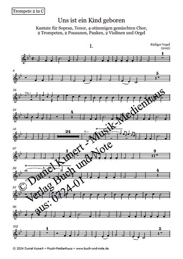 - Besetzung Soli (ST), gemischter Chor (SATB), 2 Trompeten, Pauke, 2 Violinen, 2 Posaunen und Orgel