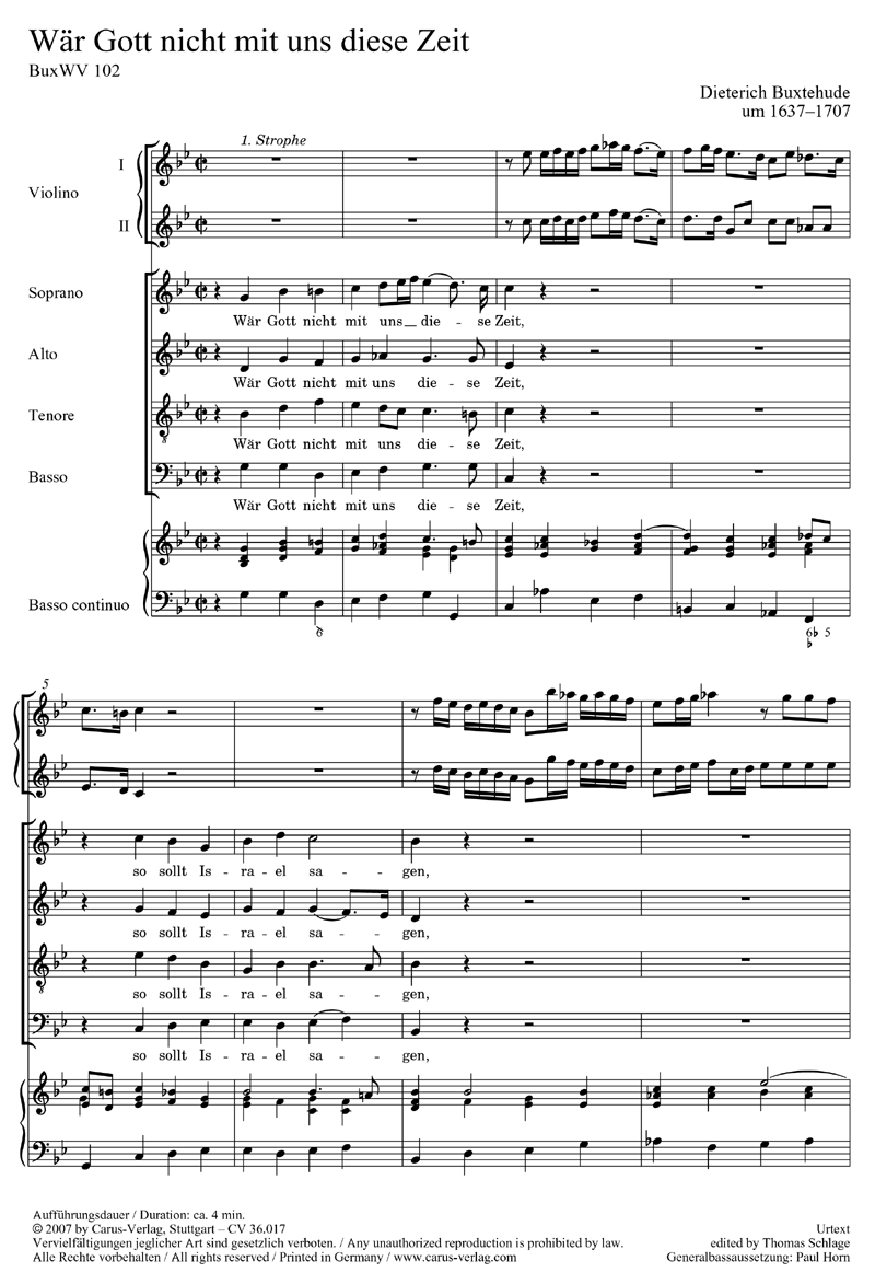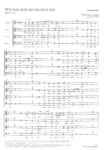 Die Vertonung des Luther-Liedes ist exemplarisch für die Grundkonzeption einer Choralkantate, wie sie Buxtehude wohl vorschwebte. Ein vierstimmiger, homophoner Satz trägt den Text der ersten beiden Strophen zeilenweise vor. Die beiden Violinen überbrücken mit Zwischenspielen den Choral und leiten in einer Art Ritornell zur nächst folgenden Strophe über. In der dritten und letzten Strophe weicht Buxtehude von diesem Modell ab, indem er die Violinen an dem Vortrag des Chorals beteiligt und Choralzeilen zusammenfasst. Die Kantate ist in einer Tabulatur aus der Düben-Sammlung überliefert. Sie gehört in den Kontext einer Zahl von Choralkantaten, die um das Jahr 1685 kopiert worden sind. - Coro SATB, 2 Vl, Bc