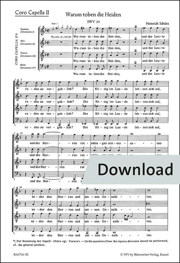 Psalm 2 aus Psalmen Davids für 2 Favoritchöre, 2 Capellchöre und Basso continuo. Urtext der Neuen Schütz-Ausgabe. Gemischter Chor (4)-SATB+SATB+SATB+SATB, Basso continuo