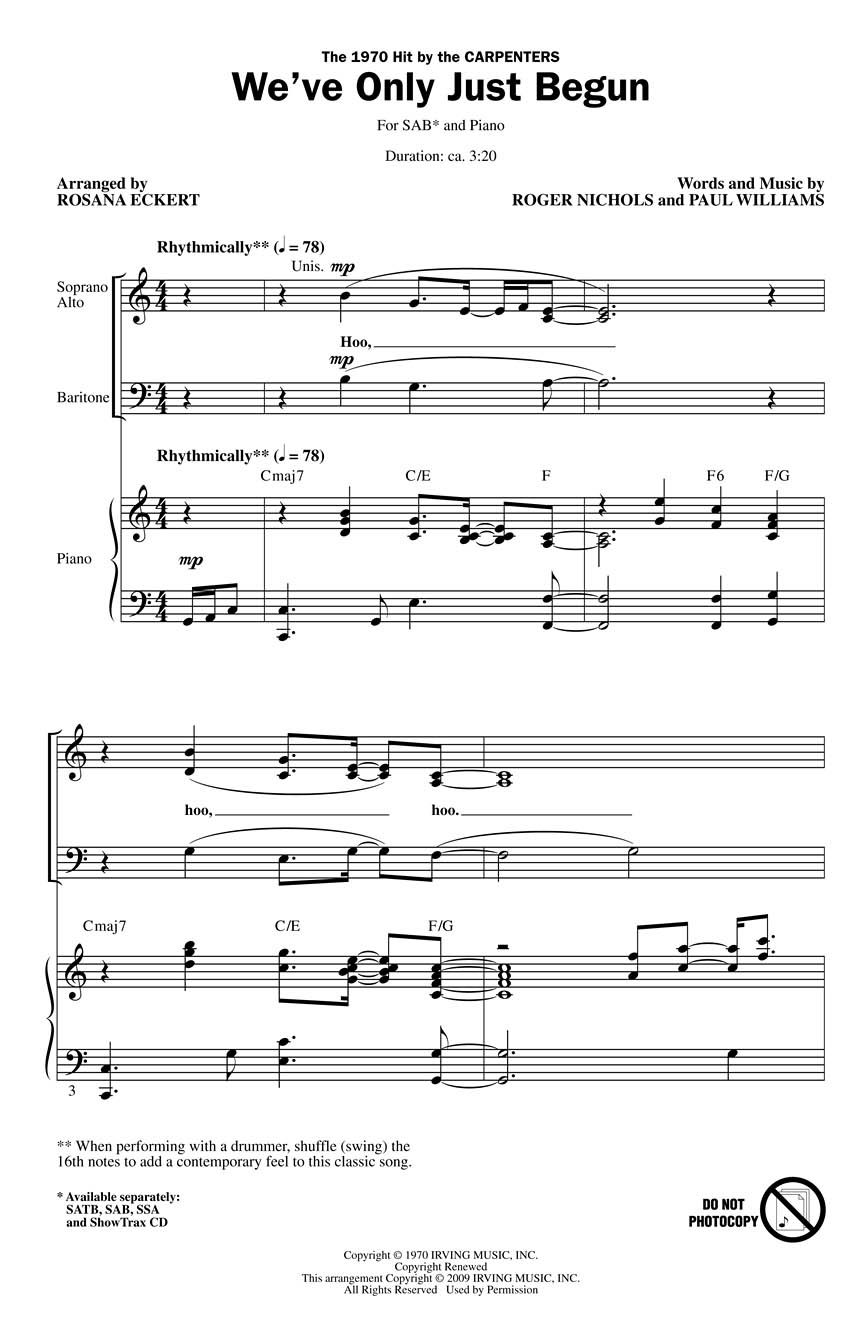 One of the top groups of the 1970s, the Carpenters are one of the best-selling musical artists of all time. The smooth melodic lines of this pop hit from 1970 makes it an excellent choice for graduation and other end-of-the-year programs. Available separately: SATB, SAB, SSA, ShowTrax CD. Duration: ca. 3:20.