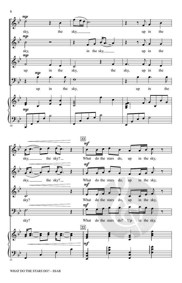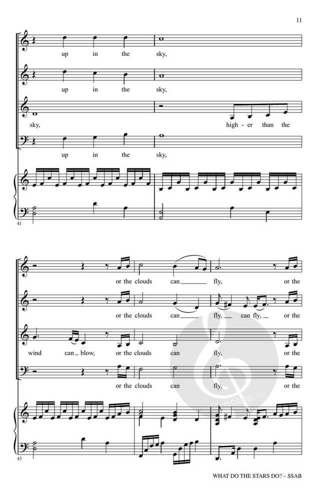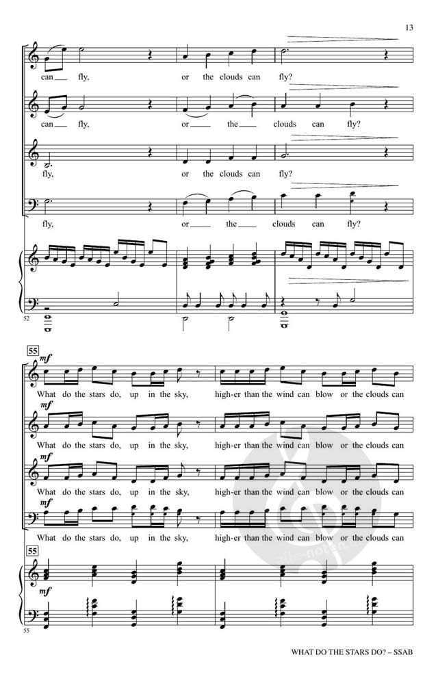 Rossettis Gedicht erforscht die himmlischen Wunder und kontrastiert ihre Existenz mit den Beschränkungen der irdischen Elemente wie Wind und Wolken. Jeder Stern erfüllt seinen göttlichen Zweck und bewegt sich in einem unendlichen Kreislauf. Diese SSAB-Vertonung ist für Chöre gedacht, die eine Bariton-Linie mit SSA-Hochstimmen benötigen. Sie ist wunderschön arrangiert und kann sowohl unabhängig als auch vierstimmig gesungen werden.