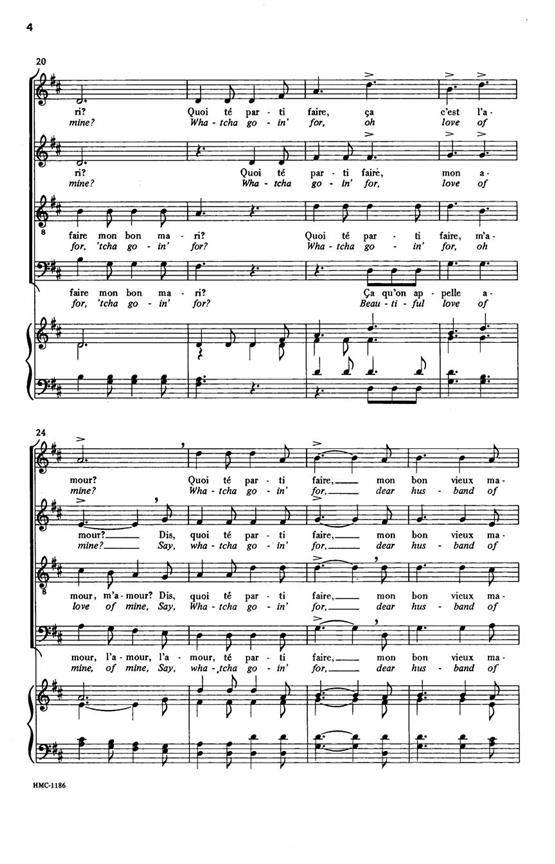 This moderately easy Cajun folk-song would be a spectacular addition to a Jr. high or high school choral program, fun and lively, with spoken parts in typical upbeat Cajun style.