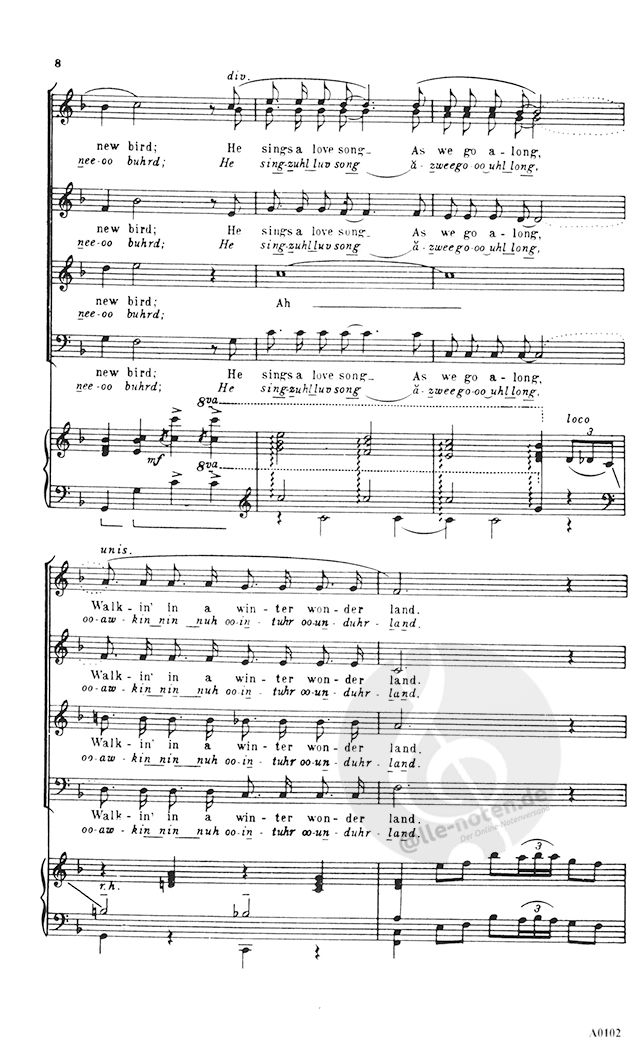 Felix Bernard's popular Christmas classic Winter Wonderland has been arranged by Leo Arnaud and transcribed for mixed chorus by Charles Naylor.