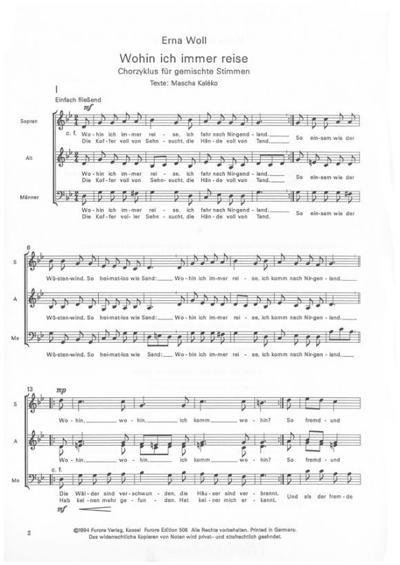 Das stimmungsvolle Chorwerk "Wohin ich immer reise" stammt von der Komponistin und Kirchenmusikerin Erna Woll. In ihrer charakteristischen Tonsprache, die Schlichtheit mit tiefer Ausdruckskraft verbindet, vertont sie einen Text, der das Motiv der Wanderschaft und die Gewissheit göttlichen Schutzes auf allen Wegen thematisiert. Die Komposition zeichnet sich durch eine klare, oft volksliedhafte Melodik und eine feinsinnige Harmonik aus, die das Vertrauen in die beständige Begleitung Gottes musikalisch erfahrbar macht. Als ein Werk der gemäßigten Moderne ist es besonders für seine Sanglichkeit und seine besinnliche Atmosphäre geschätzt und stellt eine wertvolle Bereicherung für das geistliche und weltliche Repertoire vieler Chöre dar.